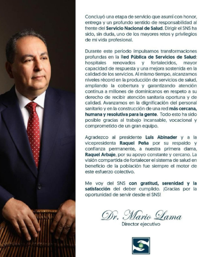 “Me voy del SNS con gratitud, serenidad y la satisfacción del deber cumplido”, concluyó Lama, en una semana marcada por cambios y reestructuraciones dispuestos por el Poder Ejecutivo como parte de una nueva etapa gubernamental.